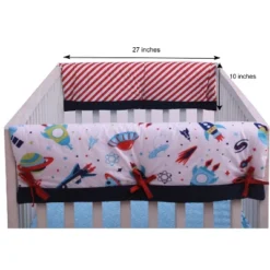 - This Bacati 10-piece Crib Set Includes Reversible Comforter/Playmat (33 x 43 inches), Two Crib fitted sheets (52 x 28 x 6 inches), Crib Skirt/Dust ruffle (13 inch drop) Diaper Stacker (holds more than 30 newborn diapers), Window Valance (15 h x 56 w inches with 1.75 inch Rod Pocket), 3 pc Wall Hangings Set and Musical Mobile in fun, colorful and signature prints in 100 percent cotton 200 Thread Count percale fabrics. Designed in United States by Experienced Designers. Many coordinating items available to purchase separately in this Bacati Clouds in the City Mint/Gray Bedding Collection.