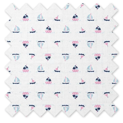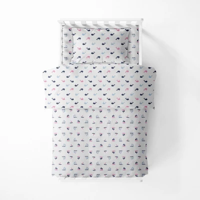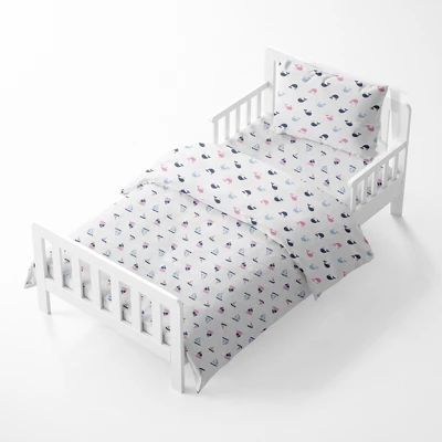 - This Bacati 4-piece Muslin Toddler Bedding Set Set Includes Reversible Oversize Comforter (42 x 55 inches), 2 Toddler Bed Fitted Sheets (52 x 28 x 6 inches) : One is boats print and another one in whales print and Standard Pillow Case (20 x 25 inches) with french ties on the back in fun, colorful and signature prints in 100 percent cotton Muslin fabrics. Designed in United States by Experienced Designers. Many coordinating items available to purchase separately in this Bacati Little Sailor Boats/Whales Girls Muslin Bedding Collection.
