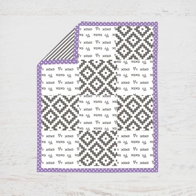 - This Bacati 4-piece Crib Set Includes Reversible Comforter/Playmat (33 x 43 inches), Crib fitted sheet (52 x 28 x 6 inches), Crib Skirt/Dust ruffle (13 inch drop) and Diaper Stacker (holds more than 30 newborn diapers) in fun, colorful and signature prints in 100 percent cotton 200 Thread Count percale fabrics. Designed in United States by Experienced Designers. Many coordinating items available to purchase separately in this Bacati Love Gray Lilac Bedding Collection.