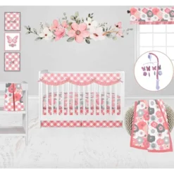 - This Bacati 10-piece Crib Set Includes Reversible Comforter/Playmat (33 x 43 inches), Crib fitted sheet (52 x 28 x 6 inches), Crib Skirt/Dust ruffle (13 inch drop) Diaper Stacker (holds more than 30 newborn diapers), Reversible Long Crib Rail Guard Cover (52 x 12 inches), Window Valance (15 h x 56 w inches with 1.75 inch Rod Pocket), 3 pc Wall Hangings Set and Musical Mobile in fun, colorful and signature prints in 100 percent cotton 200 Thread Count percale fabrics. Designed in United States by Experienced Designers. Many coordinating items available to purchase separately in this Bacati Ladybugs Pink Chocolate Bedding Collection.