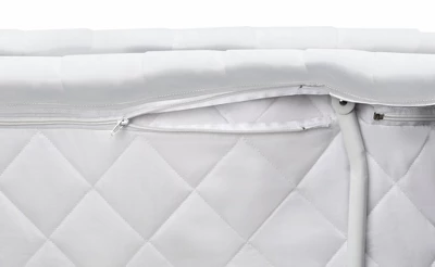 Badger Basket’s lovely Wishes Bassinet comes complete with everything your baby needs for the first few months of sleep. Classic, cozy, and comfortable, it features crisp bedding with a floor-length pleated skirt, finished off with a wide ribbon belt tied into a big bow. Generously sized, adjustable canopy completes they stylish look. The hooded, locking caster wheels can be flipped up to rock the bassinet like a cradle! Convert the bassinet to the cradle position easily – no tools needed. Mesh storage basket beneath the bassinet is handy for feeding and diaper changing necessities and toys. Canopy is easily folded down out of the way to tend to your precious bundle inside. Complete bedding set (hood, fitted sheet, and quilted liner/skirt) and foam pad included. White, metal bassinet frame assembles quickly without tools and the bedding is easily attached (and easily unzipped and detached for washing). The long, flowing skirt conceals the mesh storage basket and hides the bassinet stand. White, fitted sheet covers the custom fitted, vinyl-covered-foam pad. Bedding fabric is 100% Polyester. Bassinet is made with powder coated steel metal tubing, PP and ABS plastic, nylon, engineered wood, and PEVA (non-PVC) vinyl, and polyurethane foam. Overall unit (with hood up): 33 inches L x 17 inches W x 41.5 inches H with the wheels down (39 inches with the wheels flipped up in rocking cradle position). Height from the rim of the bassinet to the floor: 28.5 inches H with the wheels down and 26 inches H with the wheels up. Canopy height when fully open: 13 inches H. Base of bassinet (below where baby sleeps): 25.5 inches L x 17 inches W x 19 inches H with the wheels down (16.5 inches H with the wheels flipped up in rocking cradle position). Interior of bassinet measures 32 inches L x 15 inches W x 8.5 inches deep. Foam pad: 32 inches L x 15 inches W x 1 inch H. Mesh storage basket: 18 inches L x 10.5 inches W x 4.5 inches H. There is about 5.5 inches of clearance between top of basket and bottom of bassinet. Assembled product weight: 12.1 pounds. All measurements approximate. All bedding is machine washable (in cold water and gentle cycle). Tumble dry low heat. Iron on low setting no steam if needed. Adult assembly required. No tools needed for assembly. Illustrated instructions included. Bassinet is for use up to 20 lbs. (9.09 kg), 3-4 months, or until Baby can push up, roll over, or sit unassisted (whichever age, weight, or activity limit comes first). In order to comply with current safety standards, the mattress does not exceed 1 inch in thickness. Mesh basket is designed for lightweight items (up to 5 pounds total). Product complies with all currently applicable U.S. safety standards. Product includes a limited warranty of 30 Days Parts to the original purchaser. Product details/features subject to change at any time without notice. Props/accessories shown are for illustration purposes only and are not included with the product. Actual color/finish may vary slightly from screen display. This item ships in its original carton which may include a product photo. Additional white polyester/cotton sheets sold separately in packages of two (Model #31003).