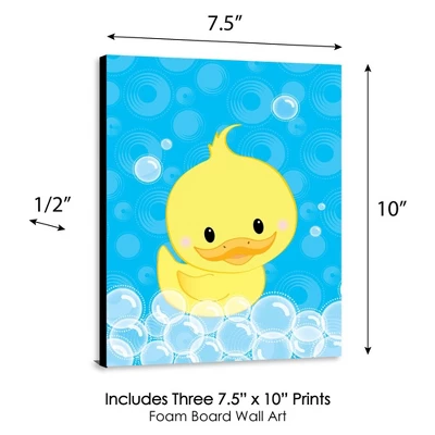 Ducky Duck Wall Art Set INCLUDES 3 ready-to-hang rubber duck themed panels and non-marking wall mounts for easy hanging. Ducky Duck artwork is perfect for a nursery, kids room or playroom. Ducky Duck Wall Art & Kids Room Decor SIZE each 10 inches high x 7.5 inches wide x .5 inches thick. Rubber ducky lightweight art prints will arrive ready to use – no frame needed. The black edge gives each print a modern, finished look. EASY TO HANG: Simply attach a non-marking wall mount (included) to each corner of a Ducky Duck art panel and press to hang in desired location. Wall mounts are repositionable, so you can redesign your artwork display at any time. PREMIUM HOME DECOR: 3-piece Ducky Duck Wall Art Set is professionally printed on thick material with a black edge. You will not need to frame this set of duck room decor. Each standout print is ready to hang and will add a contemporary touch to any room. MADE IN THE USA: Ducky Duck Nursery Wall Art & Kids Room Decor is designed and manufactured at our Wisconsin facility using materials that are Made in the USA.