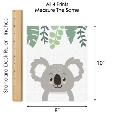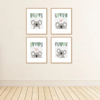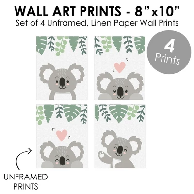 Big Dot of Happiness Koala Cutie Artisms INCLUDES: Set of 4 linen paper wall art prints. Each print SIZE 8 inches x 10 inches. These 4 unframed prints are perfect home decor for family room, living room, or bedroom. WALL ART SET: Bear & Eucalyptus unframed prints are a coordinating set of 4 prints that will give your wall a pulled together look. This set is printed for vertical wall art display. Choose to display as gallery wall set or use each print to style 4 individual moments throughout your home. HOME DECOR: Give your home a contemporary room update with Koala Cutie art prints. This set of 4 family room, living room, or bedroom design prints feature Koala Cuties and Green Leaves. HIGH-QUALITY ART PRINTS: Koala Cutie vertical wall art prints are professionally printed one-sided on textured linen paper. Linen paper gives these prints a fine finish. Set of 4 wall art prints will come unframed, giving you the creative direction to display how you like. Each linen paper print measures 8 inches x 10 inches. MADE IN THE USA: Koala Cutie linen paper wall art set is designed and manufactured at our Wisconsin facility using materials that are Made in the USA.