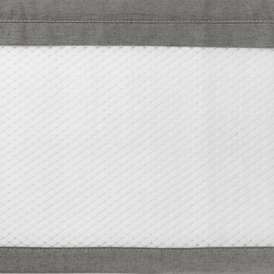 - Diamond Deluxe Mesh with linen trim — Constructed from a single-layer of Diamond Deluxe Mesh with A.C.T. Air Channel Technology (4 mm thick) to better stay taut to sides and help prevent bumps and bruises. Light blocking rating of >90%. Made of 100% polyester mesh exclusive of decoration. 2” (5.08 cm) linen trim on top and 1” (2.54 cm) linen trim on bottom. Contains no harmful chemicals, flame retardants or formaldehyde.