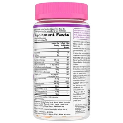 - 60-count bottle of delicious mixed berry and lemon flavored Centrum Postnatal Multivitamin Gummies