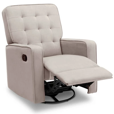 Ideal for story time or late-night feedings, the Delta Children Gavin Nursery Glider Swivel Recliner featuring LiveSmart Fabric by Culp will become the ultimate hangout spot for you and your baby. The chair features plenty of ways to unwind, it has a 360-degree swivel, gliding motion, and an easy-to-reach reclining mechanism that offers two recline positions. You can keep the seat upright and just prop up your legs or fully recline for maximum relaxation. Upholstered in the most durable fabric on the market, this recliner features LiveSmart technology, which allows spills to bead up, sitting on top of the fabric until you gently blot them away. The fabric does more than prevent stains and repel moisture–it resists everyday messes to keep the chair looking as beautiful as the day you bought it. And that’s not all, this versatile recliner works well in the nursery or any other living space in your home. Its sophisticated design with buttonless tufting and streamlined silhouette makes it a timeless choice. The Delta Children Gavin Nursery Glider Swivel Recliner featuring LiveSmart Fabric by Culp is available in a number of versatile neutrals that work well with everything.