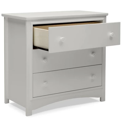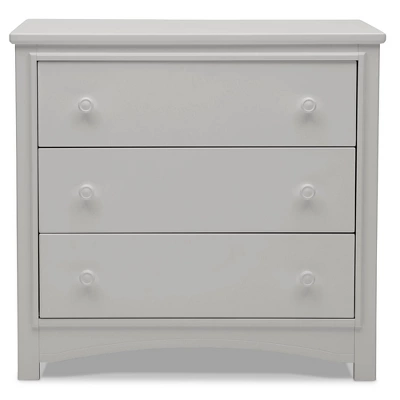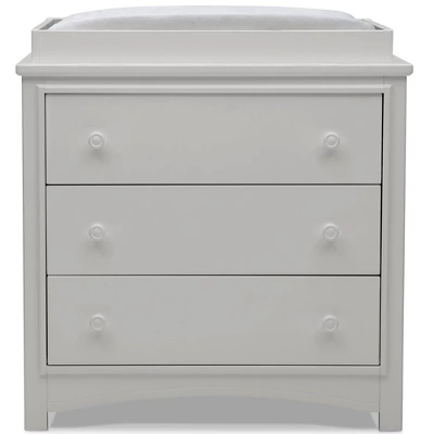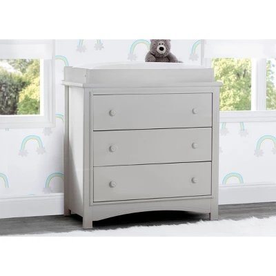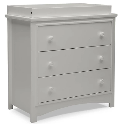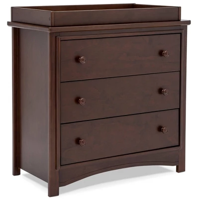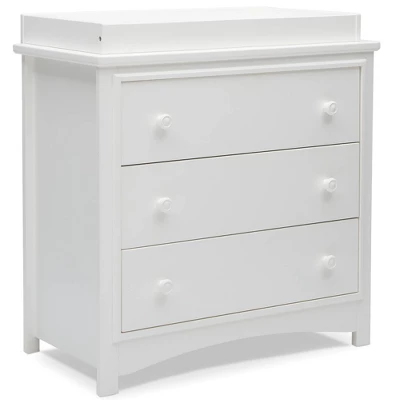 An array of smart design details makes the Perry 3 Drawer Dresser with Changing Top by Delta Children a standout style. The round drawer pulls accent the three spacious drawers that are trimmed with picture frame molding. Topped with a removable changing top, this nursery dresser creates the perfect space for diaper changing sessions now and is easily removable, so you can create a more grown-up space later on. Available in Bianca White, Moonstruck gray and Walnut Espresso. Complete your space with coordinating items in the Delta Children Perry Collection.
