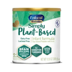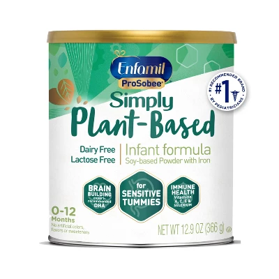 Enfamil ProSobee Baby Formula is a soy-based, lactose-free milk-free infant formula with plant-sourced protein that is naturally easy on sensitive tummies. This plant protein powder is suitable for infants with lactose intolerance and is a dairy-free alternative to milk-based baby formula. This gentle baby formula may be ideal for families with special dietary needs like vegetarian or Kosher. Enfamil ProSobee helps soothe fussiness and gas sometimes caused by milk-based infant formula while providing nutrients like Omega 3 DHA for brain support.