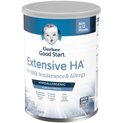 Gerber Extensive HA is a hypoallergenic formula designed to meet the nutritional needs of babies with cow’s milk protein allergy. If your baby is suspected of having CMPA or diagnosed with CMPA your baby’s doctor might recommend changing from a routine formula to a hypoallergenic infant formula. Gerber Extensive HA has been clinically proven to be hypoallergenic. It is made with 100% whey, a high quality whey protein, extensively broken down designed to be well tolerated. Gerber Extensive HA is the only hypoallergenic formula to feature B. lactis, a probiotic similar to those found in breast milk to support digestive health. Babies with cow’s milk protein allergy have been shown to have a different gut flora than babies without cow’s milk protein allergy. Feeding infants diagnosed with CMPA, an extensively hydrolyzed formula with the probiotic Bifidobacterium lactis has been shown to help promote a balanced gut flora. Gerber Extensive HA has a unique oil blend made with expert recommended DHA for brain and eye development and Medium chain triglycerides (MCT), fatty acids that are well absorbed. It has all vitamins and minerals to support baby’s growth.