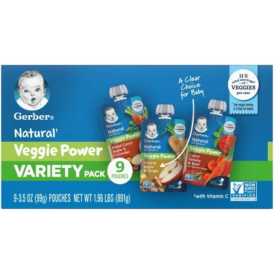 - Nine pack of 3.5 oz pouches of Gerber 2nd Foods Natural Veggie Power Variety Pack Baby Food