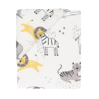 This jungle inspired 100% cotton jersey fitted crib sheet features some of our favorite jungle animals. Included are giraffes, elephants, tigers, zebras, lions, monkeys and sloths on a soft white ground. It has elastic all the way around ensuring a safe and secure fit on a standard sized crib mattress measuring 52” X 28”.