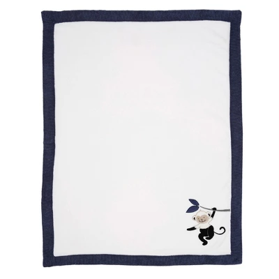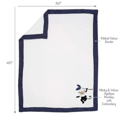 Your little adventurer will be warm and cozy with this super soft fleece blanket. Perfectly sized at 30” x 40” for cuddling. It is made in a lovely white high pile polyester faux fur with a ribbed navy velour border. An appliqued monkey is on the lower right corner holding onto a tree branch with two navy leaves. The monkey’s upper body is made in a high pile polyester faux fur and his face and lower body are velour. This blanket makes a great baby shower gift or welcome home baby gift.