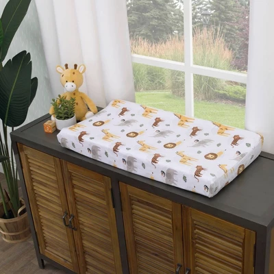 Change your little one in comfort with the NoJo Jungle Trails Changing Pad Cover. Made to fit a standard size contoured pad, the cover measures 32″ x 16″ x 6″, and features a playful animal print design of lions, elephants, giraffes and cheetahs, in shades of gray, gold, brown and green, all on a bright white background. Made from soft plush fabric for extra comfort during changes. Button-holes allow all safety straps to be utilized. Machine washable for easy care. Coordinates with the NoJo Jungle Trails nursery bedding collection.