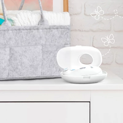Delicately shorten and file your baby’s nails with the new and improved PureBaby® Electric Nail Trimmer from Pure Enrichment®. The ergonomic design fits comfortably in your hand so you feel more confident during trimming sessions, and the easy-to-use filing pads allow you to gently care for baby’s fingernails and toenails. Switch between 2 speed settings and bidirectional rotation to create smooth nails for your baby to avoid scratches from sharp nails. The safe and gentle electric nail file features a whisper-quiet motor that is ideal for trimming your baby’s nails during naptime. Plus, the convenient LED grooming light gives you easy visibility in dim lighting.