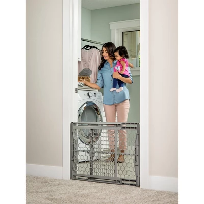 The pressure mount expandable gate has soft rubber bumpers that are gentle on your walls and make installation painless. Featuring an easy to operate twist and lock system, the gate expands in seconds to fit openings between 28-42”.