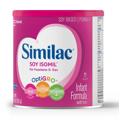 Similac Soy Isomil Infant Formula is the #1 formula for complete soy nutrition. Our baby formula is a nutritionally complete, soy-based infant formula that is iron-fortified and lactose-free. It also includes OptiGRO, our exclusive blend of DHA, Lutein and Vitamin to help support your baby’s overall growth, brain, eye and immune system development. * eligible in Similac WIC-contracted states, in-store only; **The WIC (Special Supplemental Nutrition Program for Women, Infants, and Children) and SNAP (Supplemental Nutrition Assurance Program) names are service marks of the U.S. Department of Agriculture. USDA does not endorse any goods, services, or enterprises.