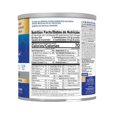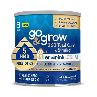 Go & Grow 360 Total Care by Similac* is the first toddler nutritional drink with 5 HMOs. HMO prebiotics support digestive health and feed good bacteria in the gut, where 70% of the immune system exists. Two servings† have 28 important nutrients for growth and development. Go & Grow 360 Total Care has our exclusive blend of DHA for brain and eye development, lutein to support eye health, and vitamin E to support developing cells. It has no artificial growth hormones‡ and is non-GMO.§ Designed for toddlers aged 12-36 months old. * Not for children with galactosemia. † 1 serving is defined as 15 g in 4 fl oz of water. ‡ No significant difference has been shown between milk derived from rbST-treated and non-rbST-treated cows. § Ingredients not genetically engineered. || Go & Grow Toddler Drinks are not for sole source nutrition.