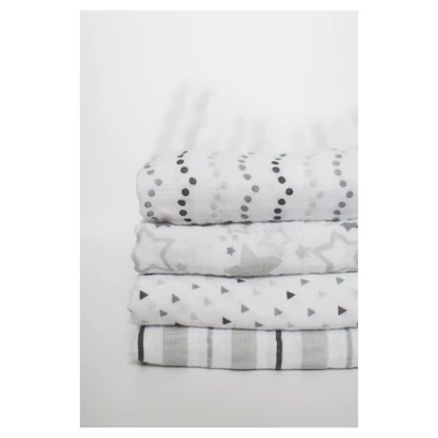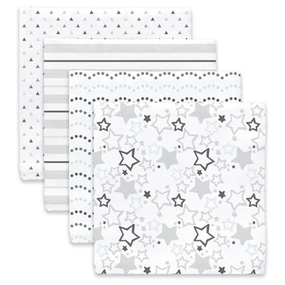 - Set of 4 lightweight, baby soft cotton swaddle blankets in complementary prints