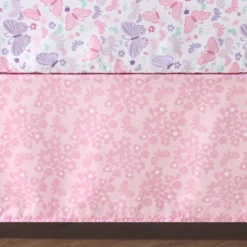 The beauty of nature comes to life in this 3-piece floral baby crib bedding set featuring the Aflutter collection by The Peanutshell. In the quilt, shades of pink and aqua play against a white ground with shimmery gold metallic accents, with flowers and butterflies tossed together on a brushstroke background, all printed on soft, easy-care microfiber. The sheet features an allover flower and butterfly print in pink, aqua, and gold on a fresh white ground, and soft against you baby girl’s skin. The 3-sided dust ruffle coordinates easily in a tonal pink dot print. A lovely addition to any baby girl’s flower and butterfly themed nursery.